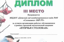 Детский сад №40 "Солнышко" в течение двух месяцев принимал участие в городском экологическом конкурсе "Птичья столовая" в г.Набережные Челны. Материал по экологическому направлению работы в детском саду был представлен в разных формах. В этом конкурсе приняли участие более 60 образовательных учреждений Республики Татарстан. Жюри конкурса высоко оценило работу педагогического коллектива и отметило Дипломом за 3 место. Поздравляем!