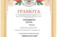 Балалар бакчасында тәрбияләнүчеләр "дөньяның игелекле фәрештәсе"иҗади конкурсында катнаштылар. Матвей Н. - Гран-при (педагоглар: Ксенофонтова С.В., Андряшина Н. Н.); Раяна Б. - 2 урын (педагоглар: Бачева О. В., Кувшинова Е. В.); Айзада Г. - 2 урын (педагоглар: Бачева О.В., Кувшинова Е.В.).