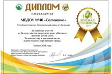 Детский сад №40 "Солнышко" отмечен дипломом участника Всероссийского экологического субботника "Зеленая весна-2019" -