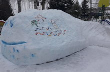 В детском саду на центральной территории в январе появились цветные снежные фигуры из сказок. Это рыба-кит из сказки "Конёк-горбунок",