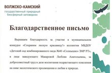 Благодарственное письмо коллективу МБДОУ №40 "Солнышко" от Волжско-Камского государственного природного биосферного заповедника за участие в муниципальном конкурсе и семинаре -