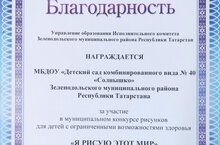 Безнең балалар бакчасы мөмкинлекләре чикләнгән балалар өчен "мин бу дөньяны ясыйм"муниципаль рәсем конкурсында катнашканы өчен рәхмәт хаты белән бүләкләнде. Бу конкурста "Лучики" компенсацияләү юнәлешендәге 5 нче төркемдә тәрбияләнүче Беляев Артем җиңүче булды! Шулай тотарга!