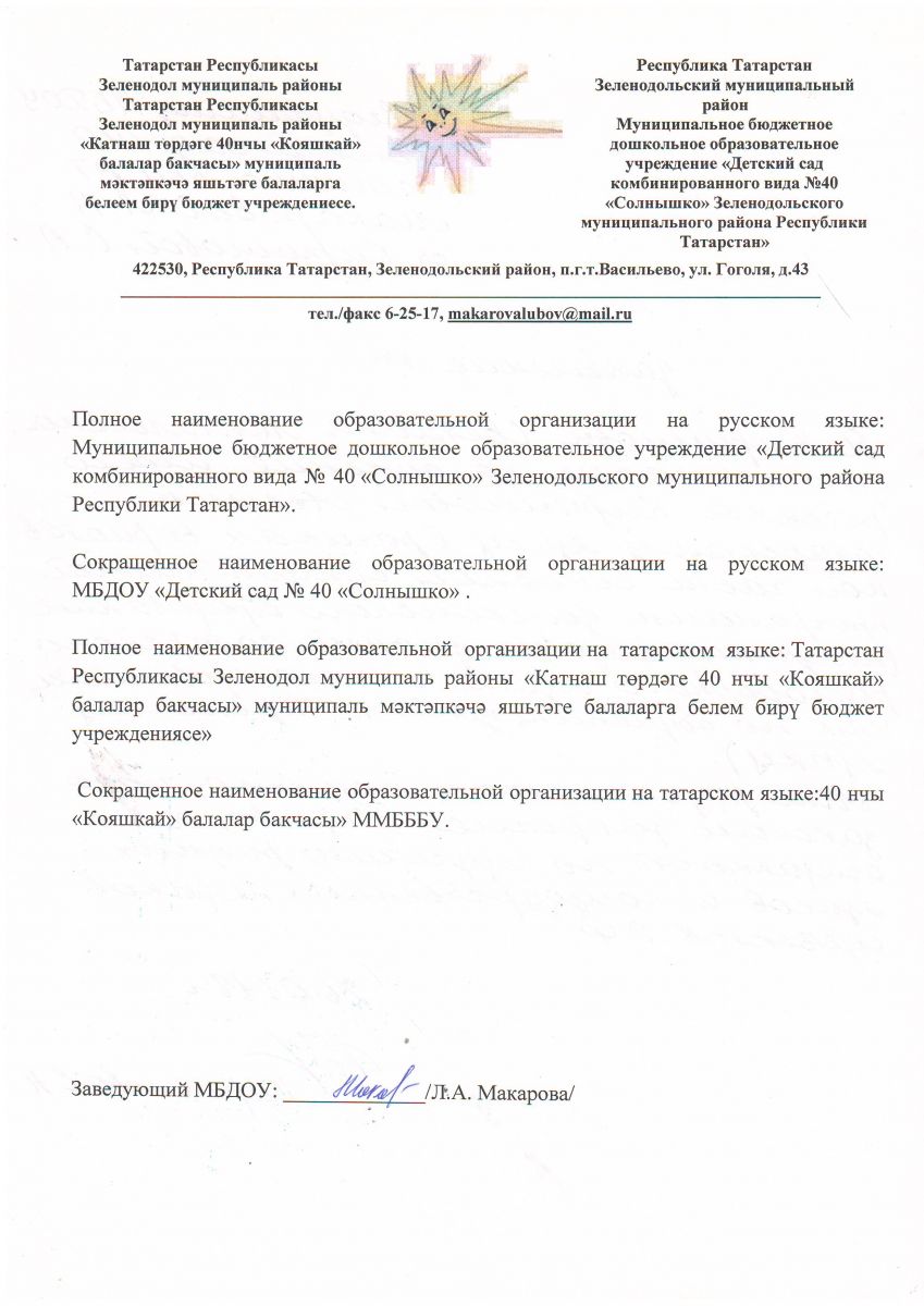 Короткое название: МБДОУ "Детский сад комбинированного вида №40 "Солнышко" ЗМР РТ"