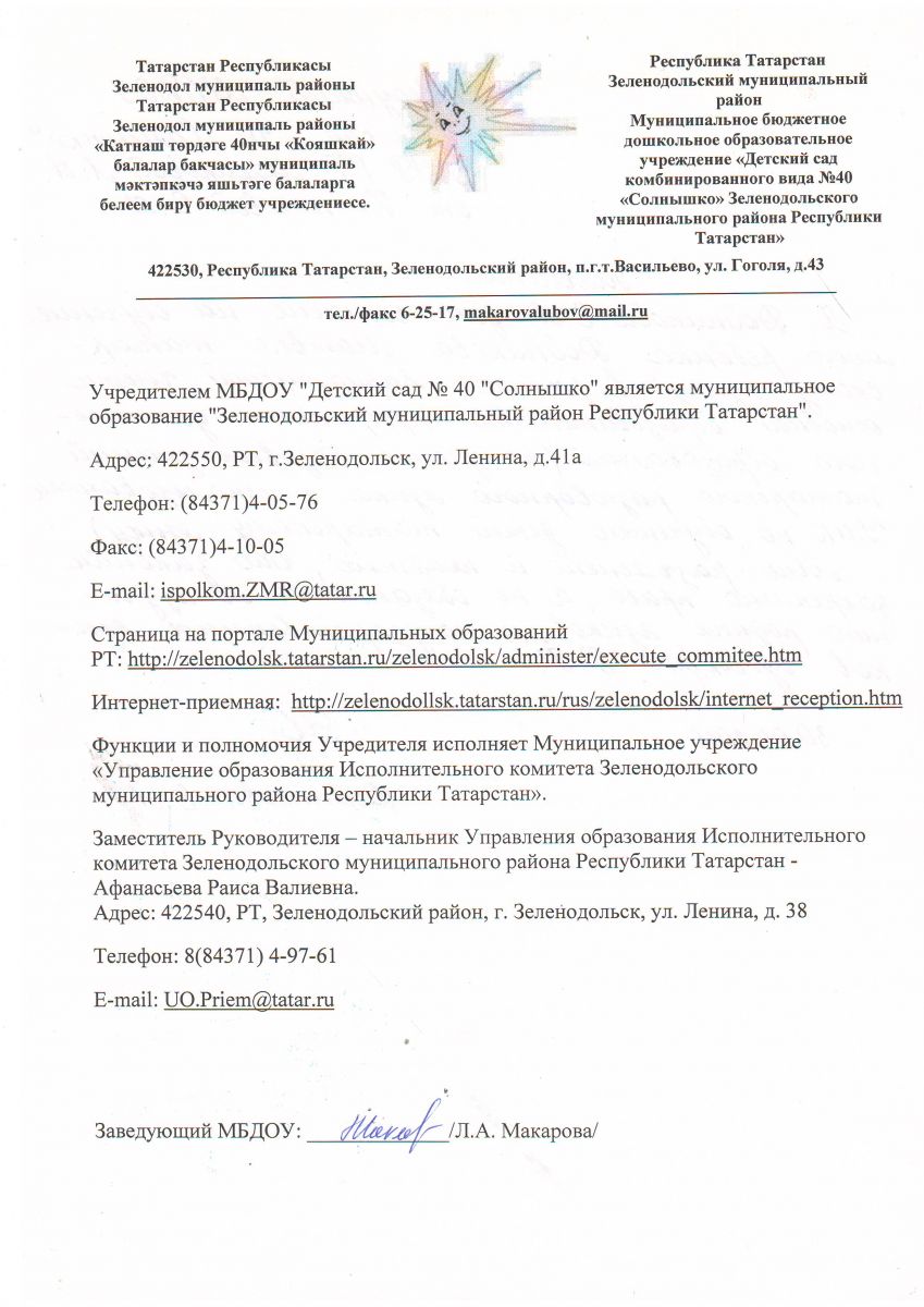 Муниципальное бюджетное дошкольное образовательное учреждение "Детский сад комбинированного вида №40 "Солнышко" Зеленодольского муниципального района РТ"/Татарстан Республикасы Зеленодол муниципаль районы "Катнаш төрдәге 40 нчы "Кояшкай" балалар бакчасы" муниципаль мәктәпкәчә яшьтәге балаларга белем бирү бюджет учреждениясе"