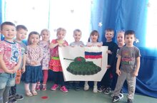 А дети средней групп №4 "Непоседы" для своих защитников выполнили коллективную работу (объёмная аппликация) "Наши танки впереди!".