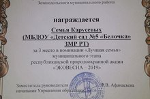 По итогам муниципального этапа республиканской природоохранной акции "Эковеснна-2019" в номинации "Лучшая семья" - семья Карусевых (она же сотрудница нашего детского сада) заняли почетное 3 место.
