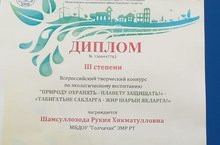 В детском садике проходят занятия по экологическому воспитанию. Воспитанница получила третье место во всероссийском творческом конкурсе на тему:" Природу охранять - планету защищать!"/ Балалар бакчасында экология тәрбиясенә багышланган чаралар күп уза. "Табигатьне саклау- җир шарын яклау" исемле рәсәйкүләм дәрәҗәдәге бәйгедә катнашып, 3 нче дәрәҗәдәге диплом белән бүләкләнде.