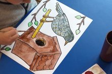 Воспитанники на занятии нарисовали скворечники. В будущем они сделают настоящие скворечники для наших скворцов/ Балалар сыерчык оялары белән таныштылар. Дөрес, әле рәсемдә генә, киләчәктә чын оялар ясау турында вәгъдә бирделәр