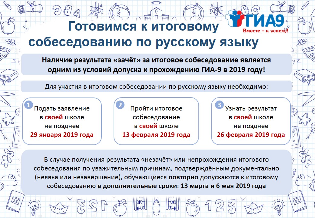 Наличие результата "зачёт" за итоговое собеседование является одним из условий допуска к прохождению государственной итоговой аттестации в 2019 году.