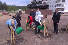 Учащиеся школы регулярно участвуют в работах по благоустройству сквера - поливают молодую сирень, посаженную в день открытия сквера, проводят там субботники.