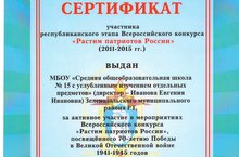Наша школа получила Сертификат за активное участие в республиканском этапе Всероссийского конкурса "Растим патритов России", посвященного 70-летию Победы в Великой Отечественной войне 1941-1945 гг.