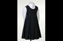 сарафан, белая блузка. Допускается жакет и классическая форма брюк.