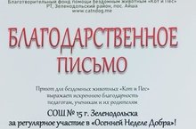 За активное участие в "Осенней Неделе Добра" приют для бездомных животных "Кот и Пёс" выражает искреннюю благодарность педагогам, ученикам и родителям нашей школы.