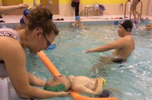 В МБОУ «СОШ № 16 ЗМР РТ» учатся 2% детей с ОВЗ и работу с такими детьми на себя взяла преподаватель физвоспитания С.А. Абрамова. Каждую субботу дети посещают бассейн ГАУ СОК «Метеор» ЗМР РТ, где проводятся занятия по освоению с водной средой. Для детей с ОВЗ важно использование упражнений, с помощью которых можно развивать координацию движений, правильную осанку, мышечно-суставный аппарат, укреплять дыхательную систему именно в воде.