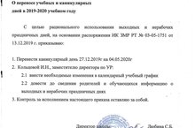 С целью рационального использования выходных и нерабочих праздничных дней, на основании распоряжения ИК ЗМР РТ № 03-05-1751 от 13.12.219г каникулярный день 27.12.2109 переносится на 04.05.2020г