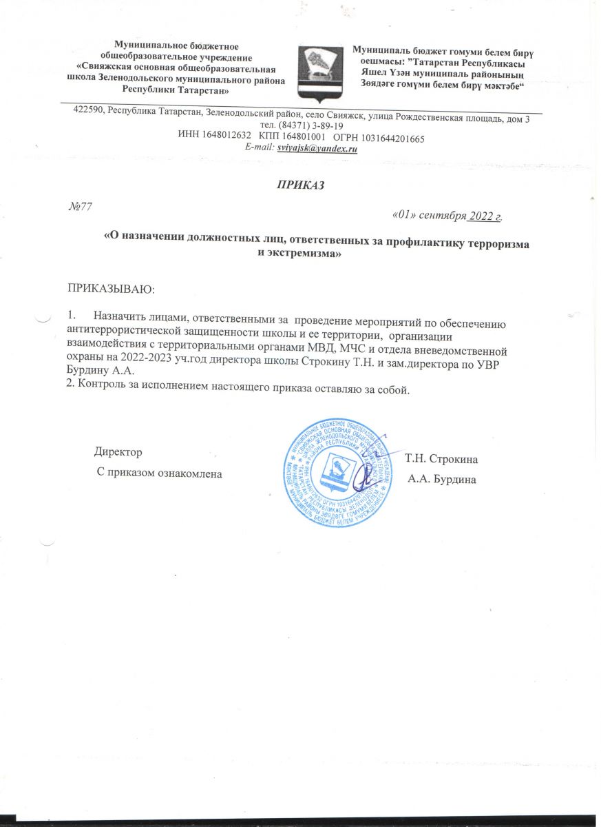Приказ о назначении должностного лица, ответственного за профилактику терроризма и экстремизма
