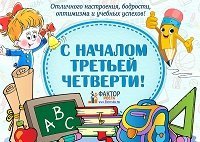 Поздравляем Вас с началом третьей четверти! Желаем коллегам - творческих успехов; родителям - терпения; ученикам - хороших отметок и прочных знаний. Начинается 3 четверть. Мы ждем Вас, отдохнувших и полных решимости окончить эту самую длинную учебную четверть хорошо и отлично! Дорогие ребята и учителя! Третья четверть самая насыщенная событиями, конкурсами, учебными и внеклассными мероприятиями. Желаем всем творческих успехов, оптимизма, побед! Творите, дерзайте!