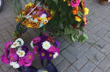 Он идёт в цветах, знамёнах.