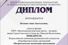 Поздравляем Волкову А.А. победителя Всероссийской олимпиады "Патриотическое воспитание школьников в современных условиях" 20.04.2022