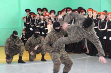 Помимо поздравительных слов сотрудники отдела специального назначения УФСИН «Барсы» подготовили для кадетов показательное выступление. Спецназовцы продемонстрировали боевые приемы борьбы, в том числе против противников, вооруженных огнестрельным и холодным оружием.