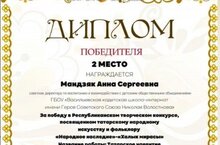 Поздравляем !!! Советник директора по воспитанию Мандзяк А.С. заняла 2 место в Республиканском творческом конкурсе, посвящённом татарскому народному искусству и фольклору "Народное наследие" 29.02.2024