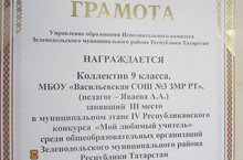 (Руководитель Яваева А.А.), занявший III место в муниципальном этапе IV Республиканского конкурса "Мой любимый учитель" среди общеобразовательных организаций Зеленодольского муниципального района Республики Татарстан. -