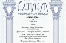 Ученик 7 класса Симашев Вагиз под руководством учителя русского языка и литературы Белокуровой Л.А. принял участие в общероссийском конкурсе сочинений "Наше лето" и получил диплом III степени.
