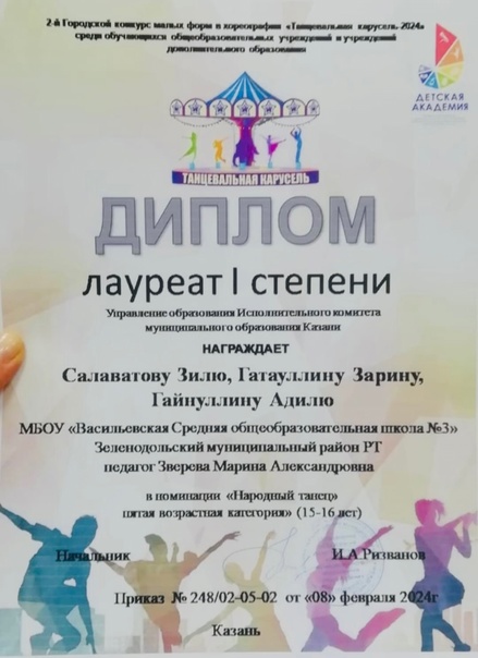 Педагог: Зверева М.А.Кызларны һәм укытучылары Зверева М.А. дәрәҗәле җиңүләре белән котлыйбыз! Киләчәктә дә уңышлар насыйп булсын!