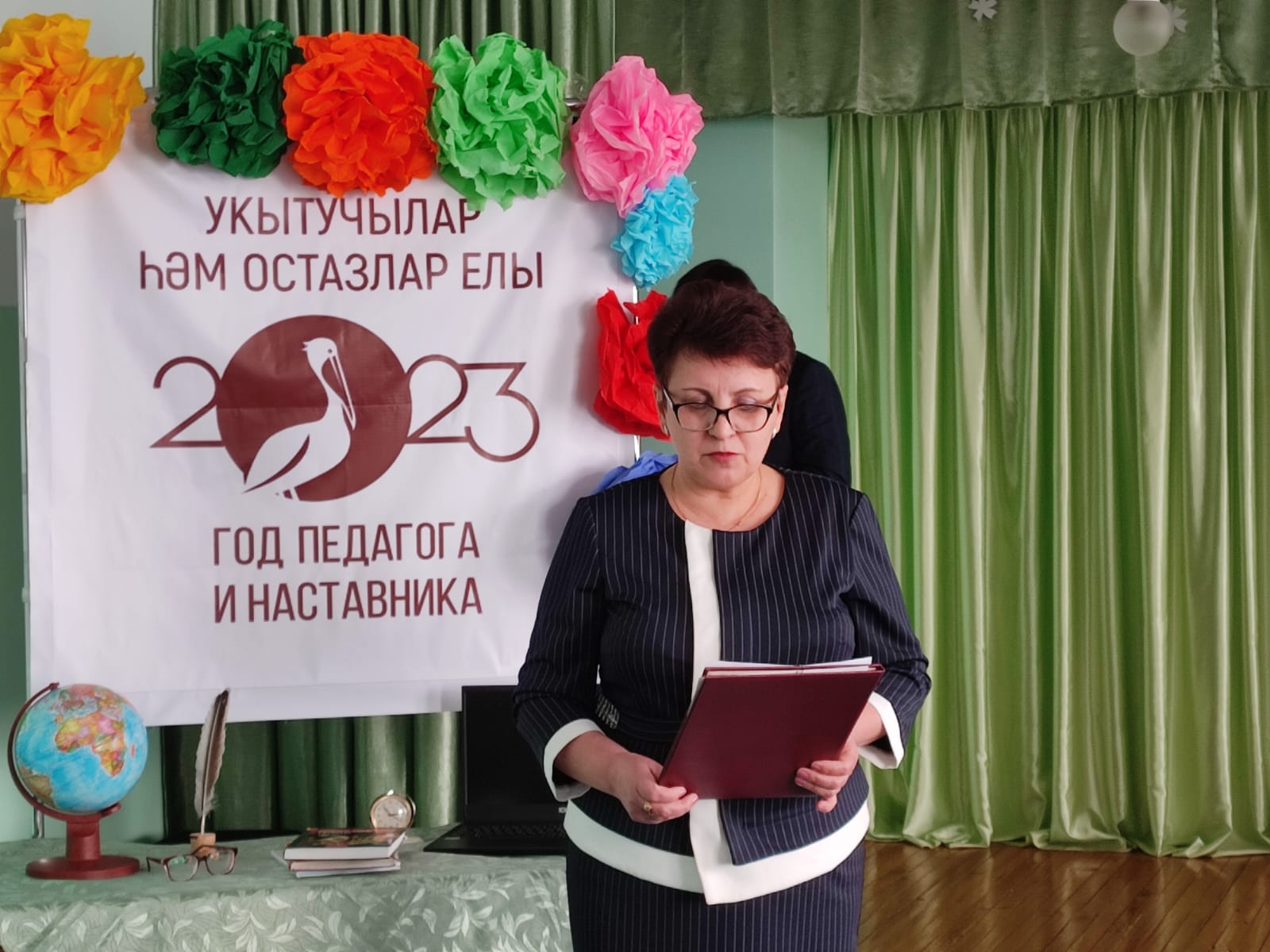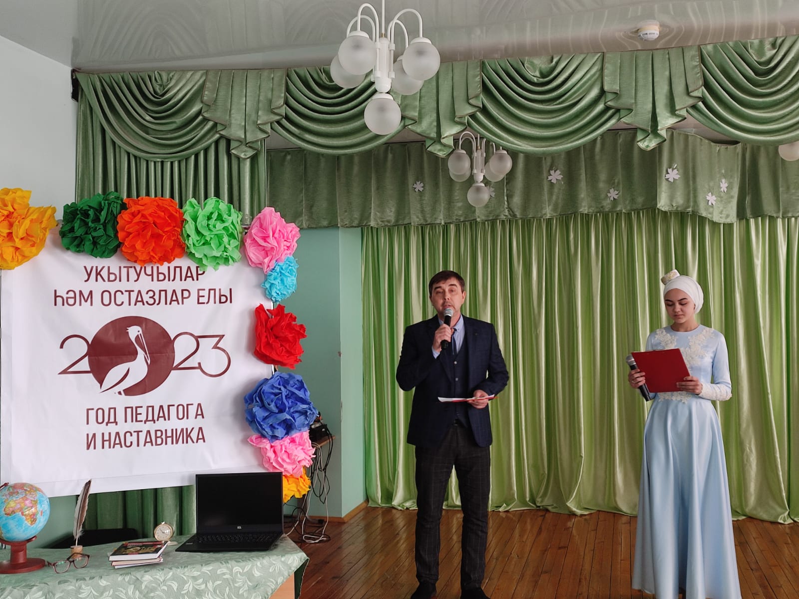 Сегодня в нашей школе состоялось торжественное открытие Года Педагога и Наставника. В зале собрались учителя и наставники - ветераны. Церемония началась с видеообращениями Главы района М. П. Афанасьева и Министра образования РФ С. С. Кравцова. Директор школы Халиуллина М. А. в свою очередь передала участникам торжества свои приветственные слова. Мероприятие сопровождалось красивыми танцами и песнями учителей и учащихся. Учителя-ветераны передали свои наставления и благодарность. В завершение мероприятия отдельные учителя были награждены благодарственными письмами Управления Образования ИК ЗМР РТ. Так в школе был дан старт Году Учителя и Наставника.Бүген мәктәбебездә Педагог һәм Остаз елын ачу тантанасы булып