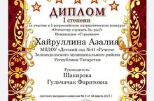 Поздравляем воспитанницу нашего детского сада Хайруллину Азалину с участием в I Всероссийском патриотическом конкурсе "Отечеству служить бы рад!" Номинация: "Строевая".
