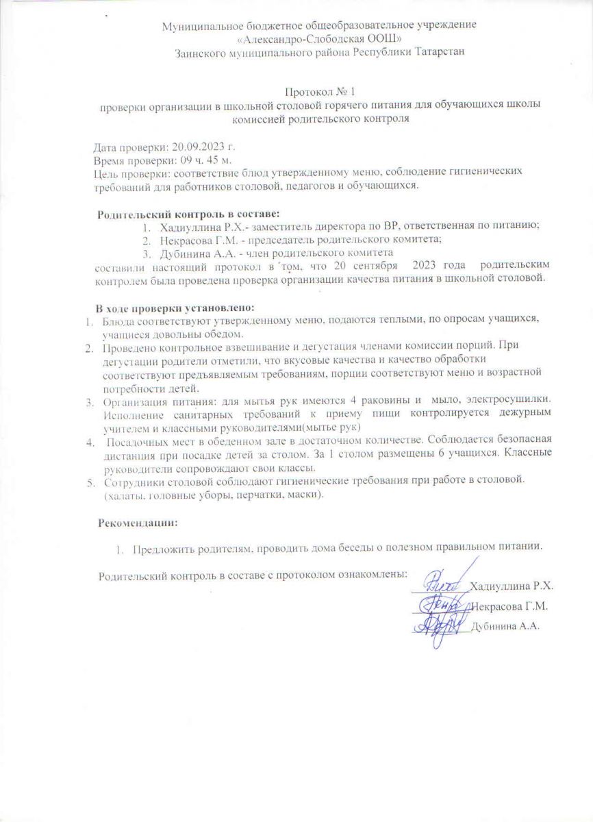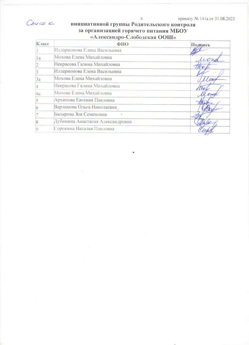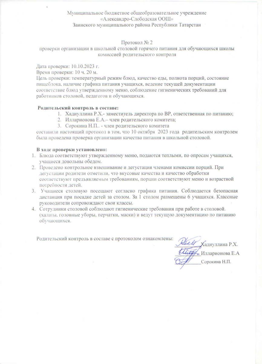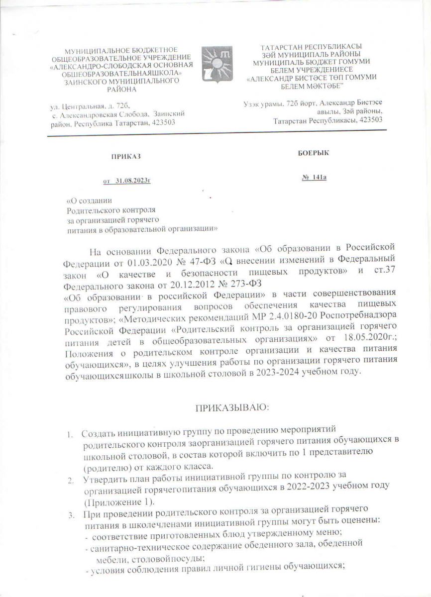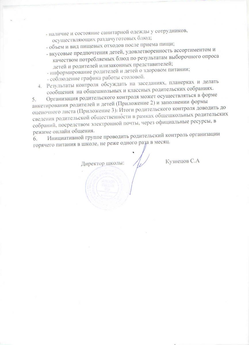 Приказ о создании РК за организацией горячего питания в ОУ: лист 1, лист 2.