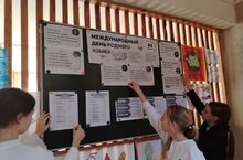 Девочки старших классов оформили в фойе школы стенд «Международный день родного языка».