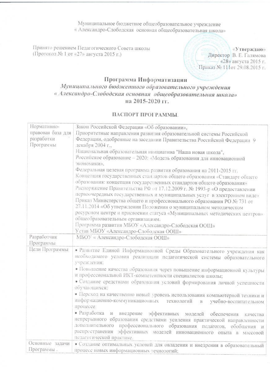 Программа информатизации МБОУ " Александро-Слободская ООШ" на 2015-2020гг. ( тит.лист, ) (смотреть)
