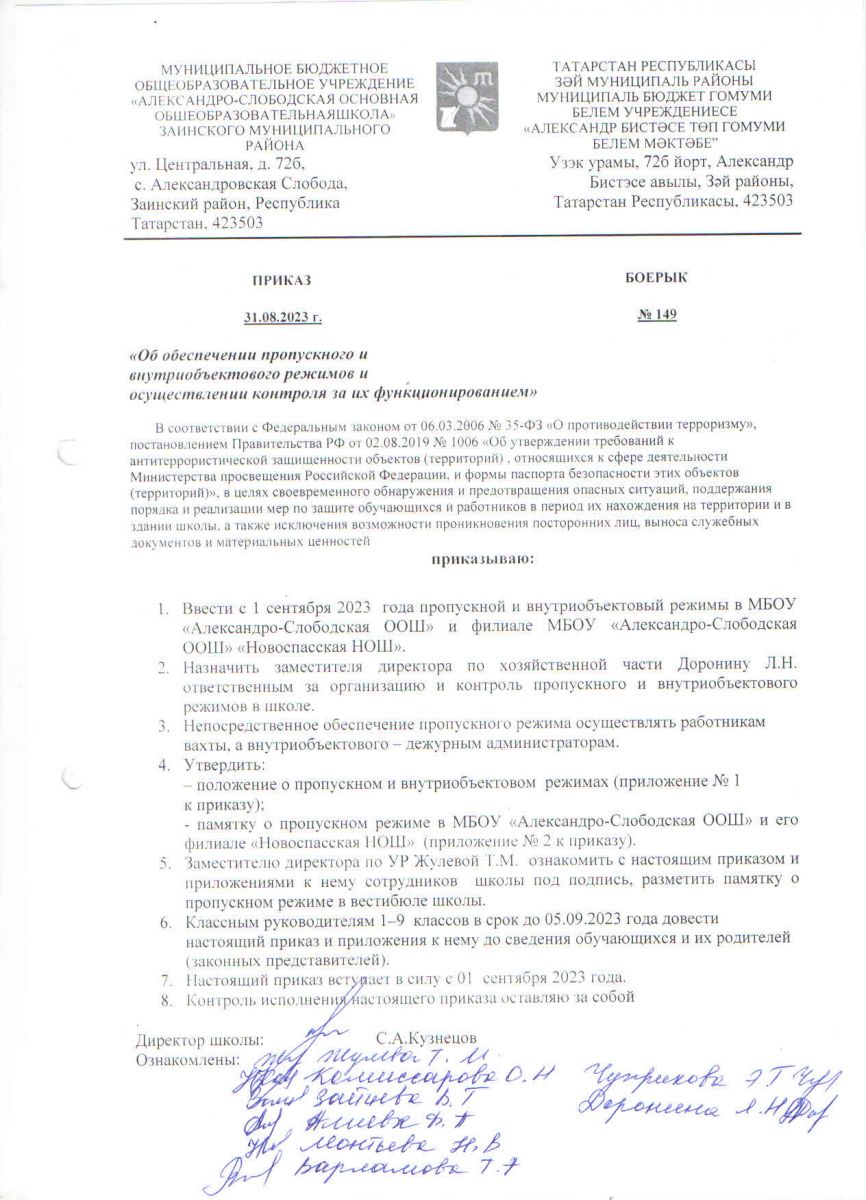 Приказ об обеспечении пропускного и внутриобъектового режима 2023-2024
