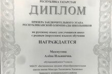 С 05 по 07 февраля 2024 года на базе оздоровительно – образовательного комплекса «Дуслык» ГАОУ «Республиканский олимпиадный центр» проведен заключительный этап республиканской олимпиады школьников по русскому языку среди учащихся школ с обучением на родном (нерусском) языке. По итогам олимпиады ученица 9 класс Махмутова Алёна стала призёром. Подготовила учитель русского языка и литературы Салихова Татьяна Куприяновна. Молодцы!