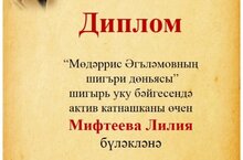 "Мөдәррис Әгъләмовның шигъри дөньясы" шигырь уку бәйгесендә актив катнашкан өчен Мифтеева Лилия бүләкләнә.