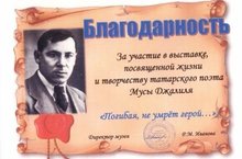 Сегодня у нас был в гостях Заинский краеведческий музей с выездной выставкой, посвященный жизни и творчеству татарского поэта Мусы Джалиля. "Погибая, не умрет музей". Затем научные сотрудники музея провели урок, посвященный 70-летию Победы "И помнит мир спасенный". Среди экспонатов были книга Памяти, солдатский медальон, гильза с места сражения, солдатская военная форма, "извещение" о смерти солдата, ксерокрпия газеты "Красный Зай" от 16 сентября 1943 года. Выставка и урок очень понравились ребятам. Они узнали много нового, так что впечатлений хватит еще надолго.
