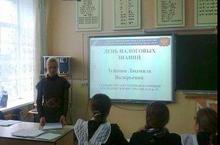 27 октября в школе прошел "День налогых знаний". Урок проводила Зуйкова Людмила Валерьевна. Ребятам в доступной форме были изложены основы налоговых знаний. Затем все присутствующие поделились на 2 команды и показали свою эрудированность и знания в этой области. Самой умной оказалась Софронова Юлия - ученица 11 класа. Ей была вручена именная грамота за подписью начальника Межрайонной ИФНС России №11 по РТ А.И.Байрамова.