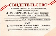Решением Регионального Штаба ВВПОД «Юнармия» Республики Татарстан юнармейскому отряду МБОУ «Чубуклинское ООШ» присвоена имя Гафиатуллина Газинура Гафиатулловича, Героя Советского Союза участника Великой Отечественной войны 1941-1945 годов.