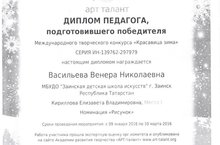 Международный творческий конкурс «Красавица зима» прошел в январе-марте 2016 года. Обучающиеся педагога Васильевой В.Н. стали победителями конкурса в номинации «Рисунок» и награждены: