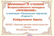 Поздравляем Хайруллину Адель, дипломанта II степени Всероссийского конкурса «Призвание» в номинации «Музыкальное творчество «Я – артист!» (педагог Котельникова Е.В.).