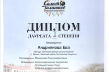 IX Международный фестиваль-конкурс детского и юношеского творчества под названием «На творческом Олимпе» в рамках международного проекта «Салют талантов» прошел с 4 по 11 июля в городе Сочи. Солистка образцового детского хореографического коллектива «Каприз» Андриянова Ева награждена дипломом лауреата II степени в номинации «Эстрадный танец. Соло».Поздравляем руководителя коллектива Маркелову Розу Альбертовну и Андриянову Еву с заслуженной наградой, желаем творческих успехов. -