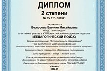 Дипломом 2 степени награждается ПДО отделения музыкального искусства Безносова Е.М. за активное участие в ⅩⅩⅠ Всероссийской конференции педагогов «Педагогический поиск» (Центр гражданского образования «Восхождение»). Поздравляем!!!