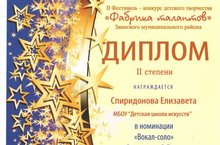 12 декабря состоялся гала–концерт ІІ Фестиваля - конкурса детского творчества «Фабрика талантов» в Заинском муниципальном районе, в котором приняла участие Спиридонова Лиза в номинации "Вокал-соло" и была награждена дипломом ІІ степени (педагог Горина М.А.). Поздравляем! Желаем дальнейших успехов!