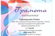 Поздравляем Гафиятуллину Азалию, занявшую 1 место в региональном конкурсе-выставке «Жар-птица 2017» (ПДО Степанова А.Н.).