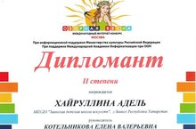 Поздравляем Хайруллину Адель, обучающуюся отделения музыкального искусства, ставшую дипломантом 2 степени Международного интернет - конкурса «Озорная весна» (ПДО Котельникова Е.В.)
