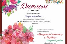 Всероссийский творческий конкурс «Весна в окно стучится» прошел в марте 2017 года. Обучающиеся педагога Дмитриевой Е. Н. стали победителями конкурса в номинации «Рисунок» и награждены: