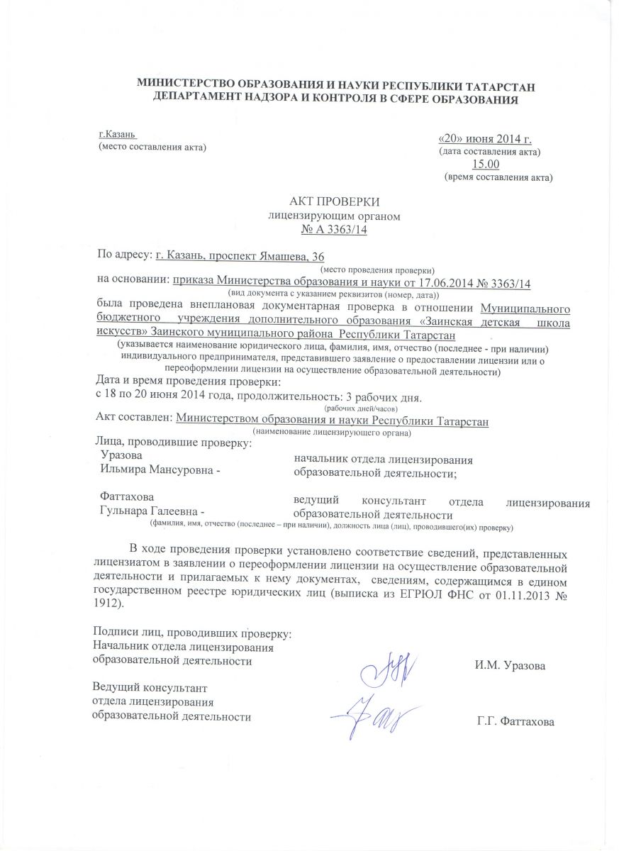 Приказ №1840/18-Д от 27.04.2018г. О проведении внеплановой выездной проверки юридического лица – МБУДО «Заинская ДШИ» ЗМР РТ.