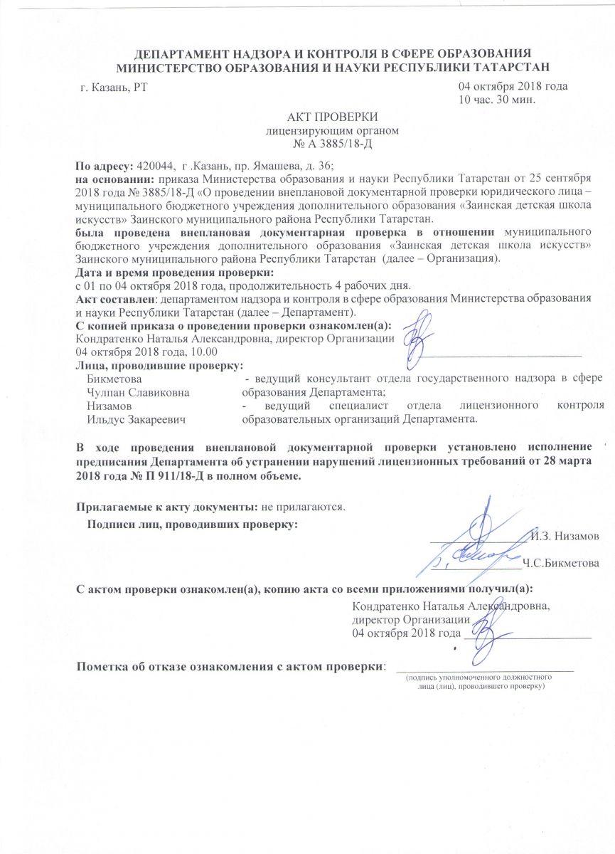 Акт проверки лицензирующим органом № А 3885/18-Д от 04.10.2018г.