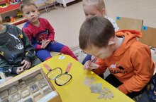 Сегодня воспитатель Галина Валентиновна с воспитанниками старшей группы изготовили из листьев, круп , ракушек "Волшебную лупу".